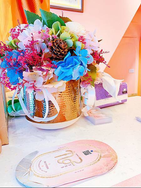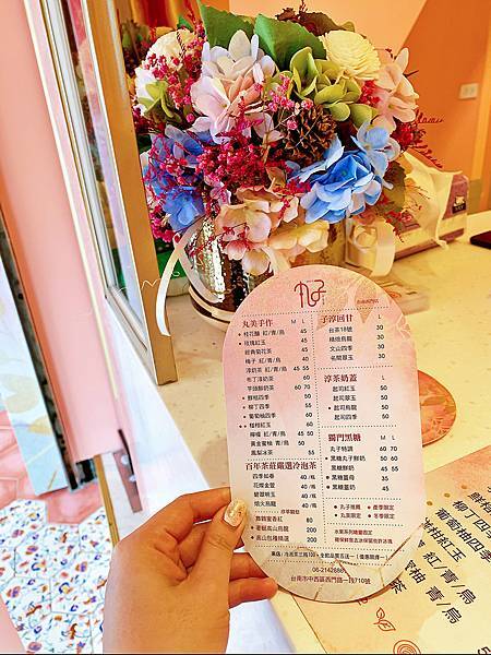 ▾整體裝潢用淡粉橘色的牆面與花花地板,櫃檯還放置了一些花朵超浪漫,菜單也好美。