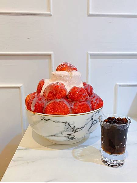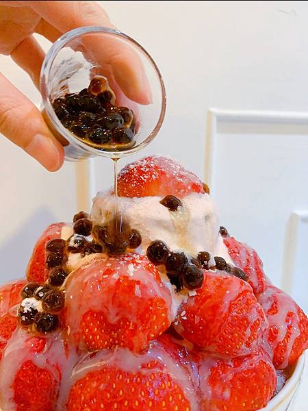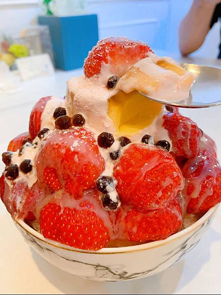 ▾我們點了一般的夢幻草莓冰 190元,有滿滿的草莓、一杯珍珠、一個布丁,還淋滿了煉乳非常彭湃。